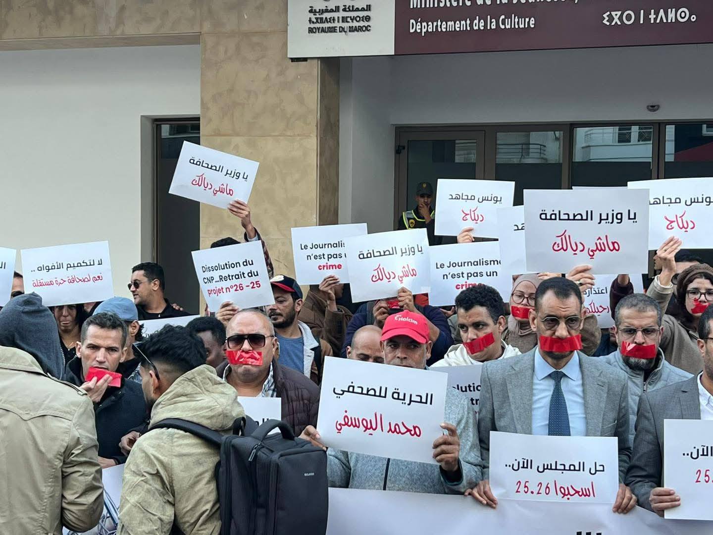 هزت العاصمة الرباط مساء يوم الجمعة الماضي 28 نونبر الجاري وقفة احتجاجية حاشدة وصامتة نفذها مئات الصحافيين والصحافيات أمام مقر وزارة الشباب والثقافة والتواصل، في مشهد وُصف بـ”التاريخي”. رفع المشاركون شعاراً موحداً يطالب بـ”الحل الفوري” للمجلس الوطني للصحافة وإسقاط ما أسموه “قانون التحكم”، وقد لبى المحتجون نداء لجنة “بيان من أجل حل المجلس الوطني للصحافة”. اختار المشاركون في هذا الشكل النضالي وضع شارات حمراء على أفواههم، كرسالة رمزية قوية تندد بسياسة “تكميم الأفواه” وتراجع منسوب الحريات الصحافية، معلنين تضامنهم المطلق مع ضحايا “التسريبات” الأخيرة. وجهت الكلمة النارية التي تليت خلال الوقفة انتقادات لاذعة لوزير القطاع، المهدي بنسعيد، واصفة إياه بـ “الوجه الأبيض الظاهر من جبل الجليد وسط بحر مهني أسود”، ومتهمة إياه بـ”التشيطين” بعد نعته للمنتقدين بـ”العدميين”. واعتبر المتحدثون أن ما كشفته تسريبات لجنة الأخلاقيات لم يكن مجرد اجتماع عادي، بل كان “مسلحاً ينزع فيه جلد الصحافي حميد المهداوي” باستعمال “الأساليب المنحطة”، كل ذلك بمباركة من “مركب المصالح” الذي يقولون إنه اختطف المهنة. كما حذر الغاضبون بشدة من خطورة مشروع القانون رقم 26.25، الذي اعتبروه “مشروع السلطة” الذي دبر “بليل” لتفصيل مجلس على مقاس “المشهرين” ولوبيات الريع، بهدف رئيسي هو تحويل الصحافة إلى مجرد أداة لإلهاء المغاربة عن قضايا الفساد والمال العام. وقد رفعت الوقفة لائحة مطالب مستعجلة، تصدرها “السحب الفوري” لمشروع القانون المثير للجدل، وفتح تحقيق مستقل وشفاف في انتهاكات لجنة الأخلاقيات، ووقف سياسة التعيين والتحكم، وإعادة بناء منظومة الدعم العمومي على أسس تضمن الشفافية والنزاهة. وفي ختام شكلهم النضالي، أكد المحتجون أن معركتهم مستمرة ولن تتوقف حتى استعادة الصحافة لدورها الطبيعي كـ “خادمة للمصلحة العامة”، ولقطع الطريق أمام كل من يسعى لتحويلها إلى بوق للدعاية وتصفية الحسابات الشخصية والسياسية.